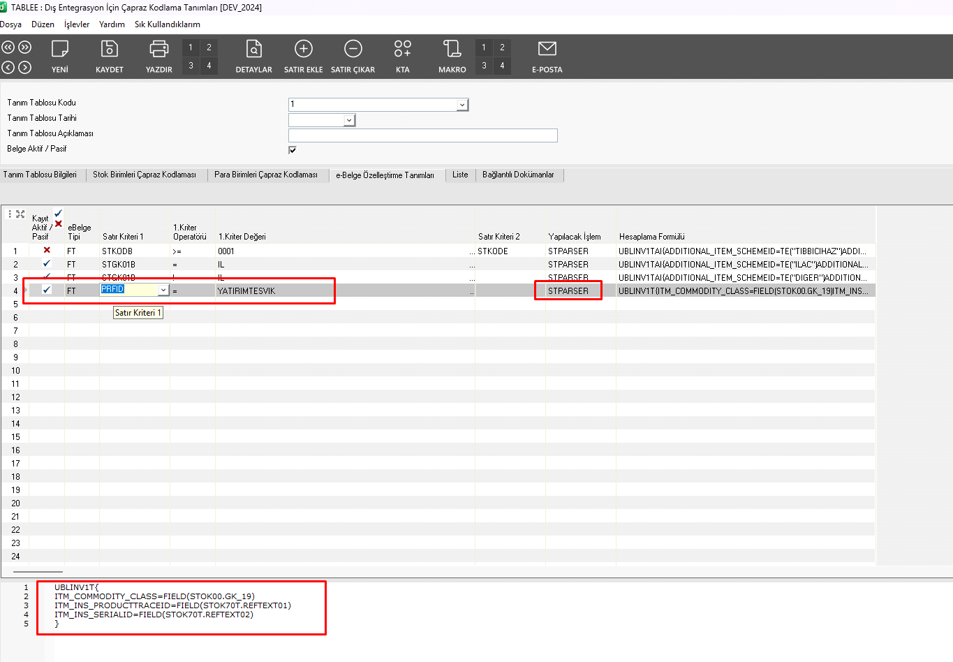 TABLEE (Dış Entegrasyon İçin Çapraz Kodlama Tanımları ) uygulamasında “e-Belge Özelleştirme Tanımları” sekmesinde tanımlamalar yapılır ve tanımlamalarda kriter verilmesi mümkündür.