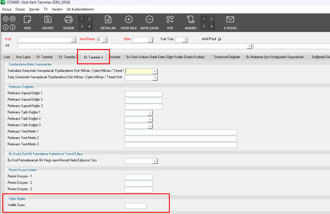 - Stok kartı tanımları (STOK00) uygulamasında Ek Tanımlar-3 sekmesinde “Yerlilik Oranı” alanını doldurmanız gerekmektedir.