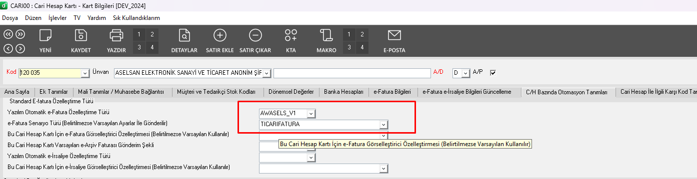 - ASELSAN’ın Cari hesap kartından (CARI00) C/H Bazında Otomasyon Tanımları sekmesinde Yazılım Otomatik ve E-Fatura Özelleştirme Türü: AWASELS_V1 olan ASELSAN özelleştirme kodunun seçilmesi gerekmektedir.