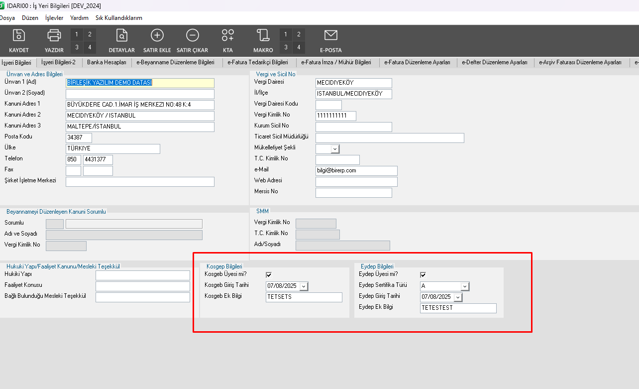 - KOSGEB ve EYDEP Bilgilerinin Tanımı : İş Yeri Bilgileri Uygulamasından (IDARI00) , İşyeri Bilgileri sekmesinde: