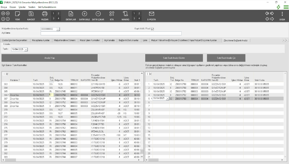 - Fiili Envanter Maliyetlendir (RECL22) uygulamasına maliyet hatası oluşması durumunda zincirleme harekete neden olan hareketlerin analizi için rapor eklenmiştir. Maliyet hatası almanız durumunda "Zincirleme Bağlantı Analizi" sekmesinden rapor oluşturulur.