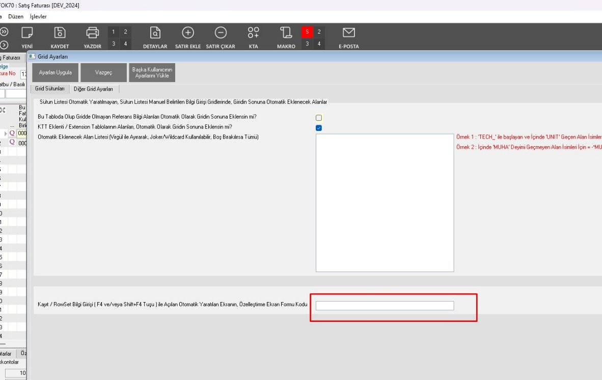 - F4 ile açılan detay pencerelerinde ekran formu özelleştirmesi seçeneği eklenmiştir. Grid ayarlarından form kodunun belirlenmesi ile kullanılabilir.