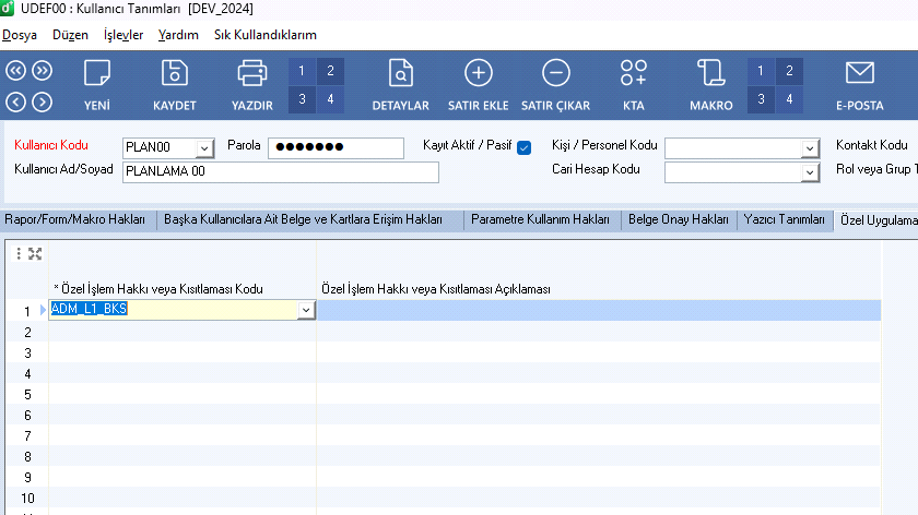 Bir belge, farklı bir kullanıcı tarafindan kilitli tutuluyorsa; bu kilidi iptal ederek işlem yapma hakkını üzerine alma işlemi yetkiye bağlıdır. Bu yetki için, Kullanıcı Tanımları |UDEF00 modülünde, “Özel Uygulama Hakları ve Kısıtları” sekmesinde, “Özel İşlem Hakkı ve Kısıtlama Kodu” alanında ADM_L1_BKS yetki kodu seçilerek kaydedilmelidir. (Resim 1)